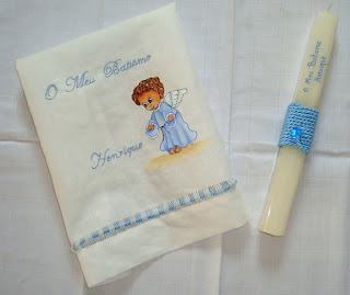 Vela com o mesmo cordão da toalha, escrito a pincel.