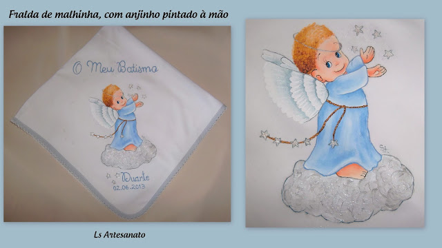Fralda em malhinha (mesmo tecido dos bodies), com viés cinza, e com anjinho pintado à mão.