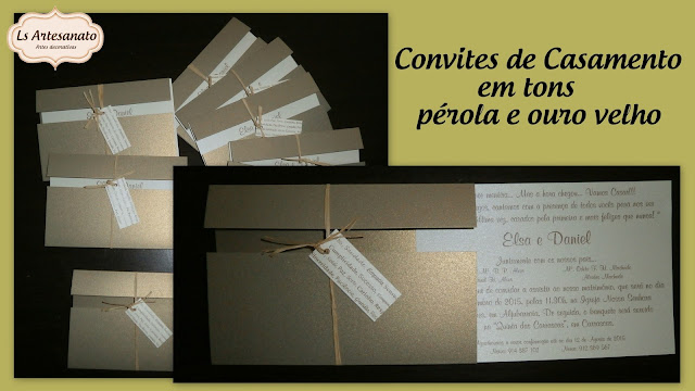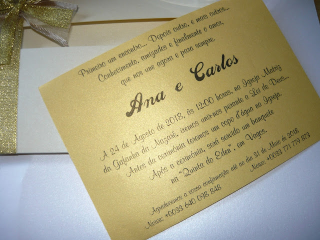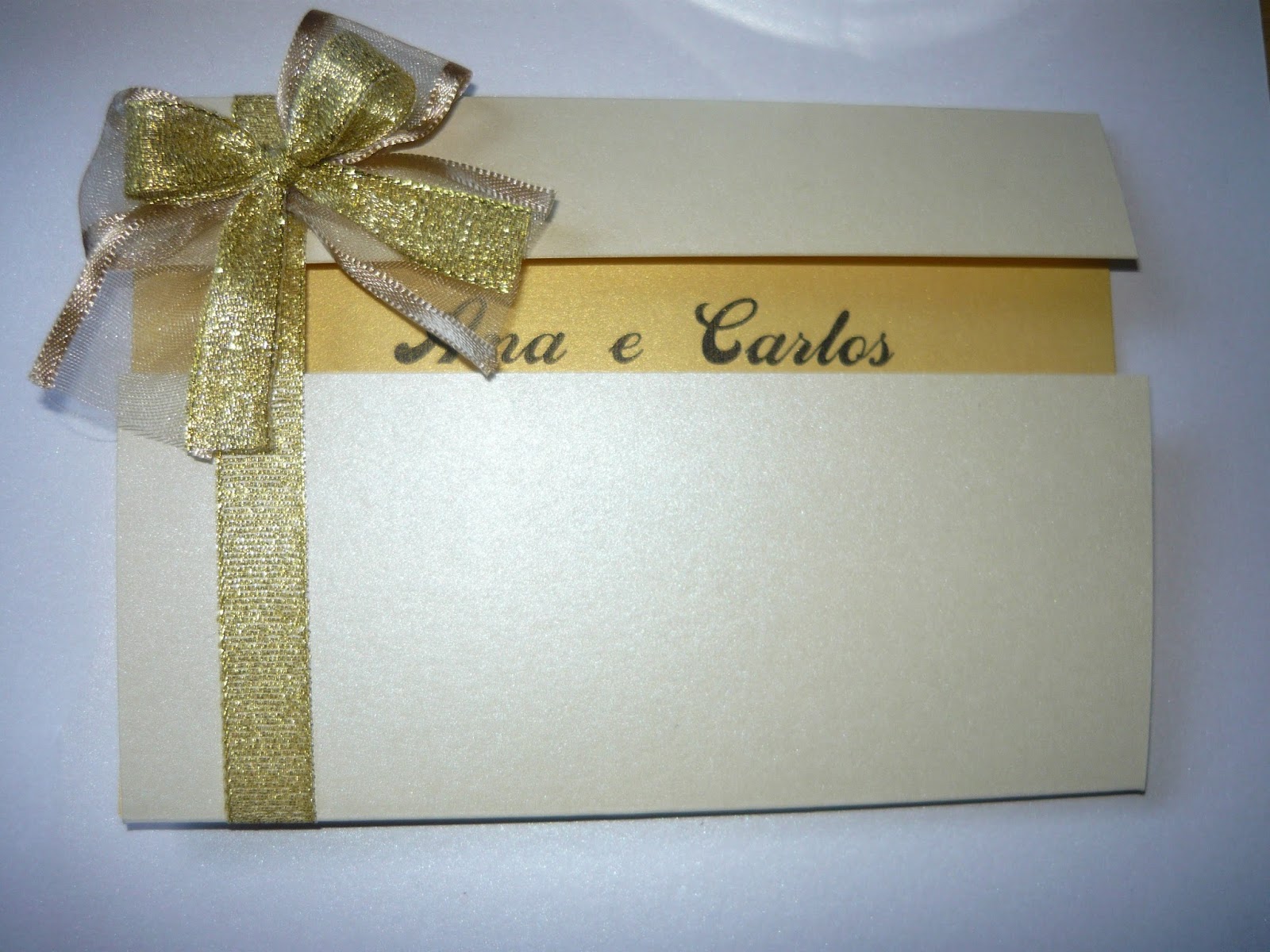 Convite em papel brulhante decorado nos tons creme e ouro.